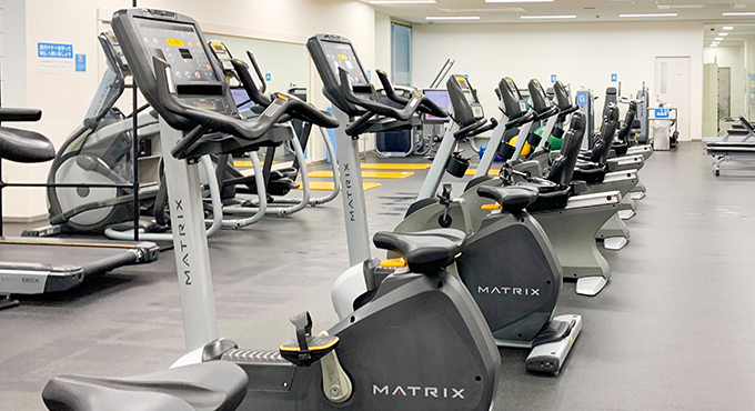 トレーニングルームには、基礎的なトレーニングが出来るアップライトバイク・リカンベントサイクル、 ウォーキングマシン、各種筋力トレーニングマシン、ダンベルなどを備えています。また、1周110mのランニングコースがあります。コインロッカー、シャワー室も完備しています。
